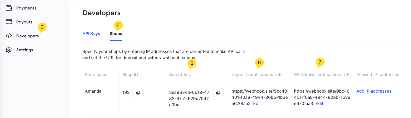 YOUR_SECRET_KEY). - In the Deposit notifications URL, specify the address that will receive our POST request when the status of a payin operation changes.